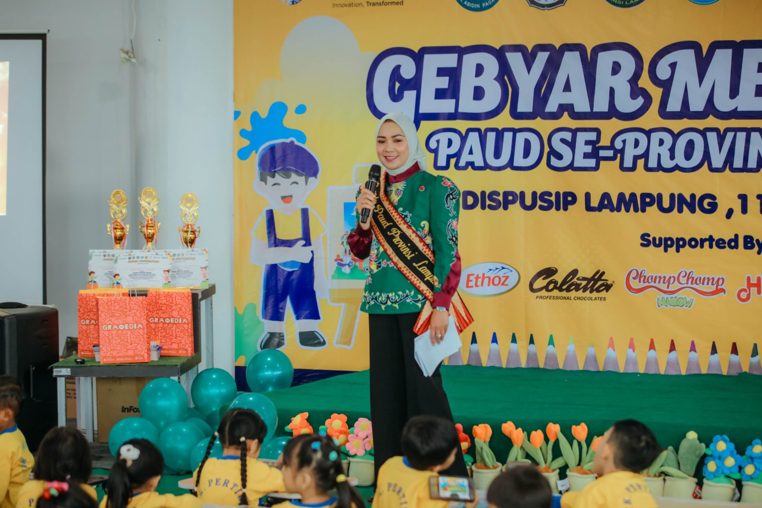 Dalam sambutannya, Bunda PAUD Lampung menyampaikan rasa bangga dan bahagia dapat bertemu langsung dengan anak-anak PAUD yang datang dari berbagai daerah, seperti Mesuji, Metro, Pringsewu, Bandar Lampung, hingga Bandar Jaya.