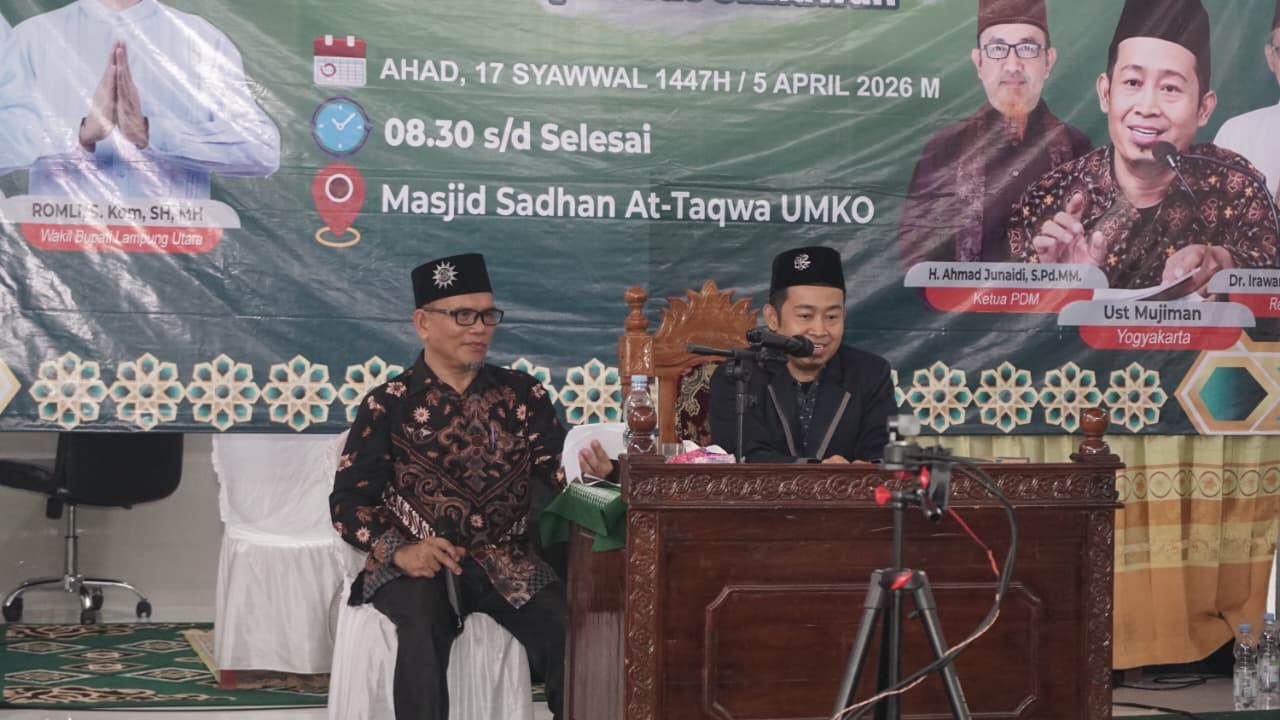 Kota Bumi — Universitas Muhammadiyah Kotabumi (UMKO) menjadi tuan rumah Pengajian Akbar Syawalan 1447 Hijriah yang diselenggarakan oleh Pimpinan Daerah Muhammadiyah (PDM) Lampung Utara di Masjid At-Taqwa Kampus UMKO, Minggu (05/04/2026). Kegiatan ini dihadiri oleh sekitar seribu jemaah yang terdiri atas civitas akademika, masyarakat umum, serta perwakilan organisasi keislaman di Lampung Utara.