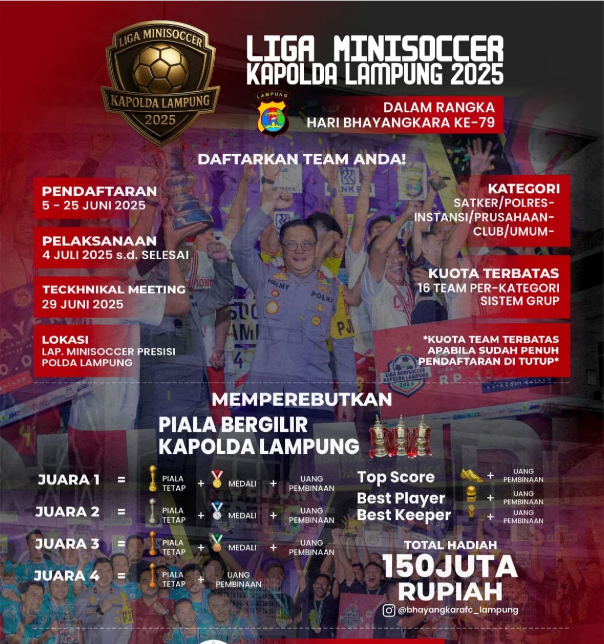 LAMPUNG – Kepolisian Daerah Lampung akan segera menggelar turnamen Minisoccer Kapolda Cup 2025 yang dijadwalkan dibuka pada 4 Juli 2025 di Lapangan Presisi Polda Lampung.